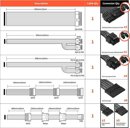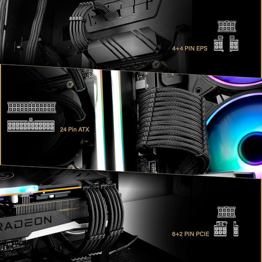 PSU Cable Extension Sleeved Custom Mod GPU PC Power Supply Soft Nylon Braided with Comb Kit 24PIN/8PIN to 6+2Pin/ 8PIN to 4+4PIN-30CM 300MM - Black